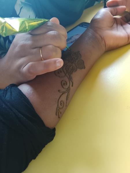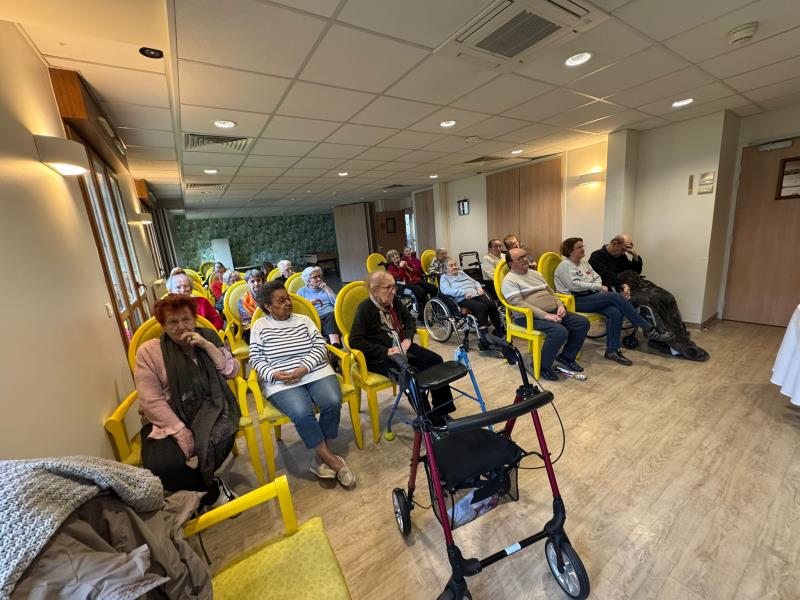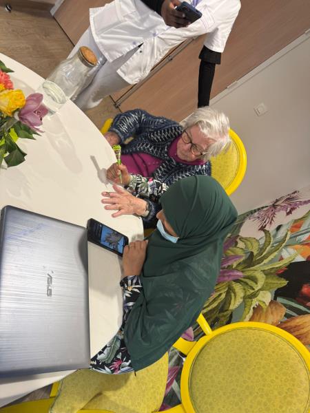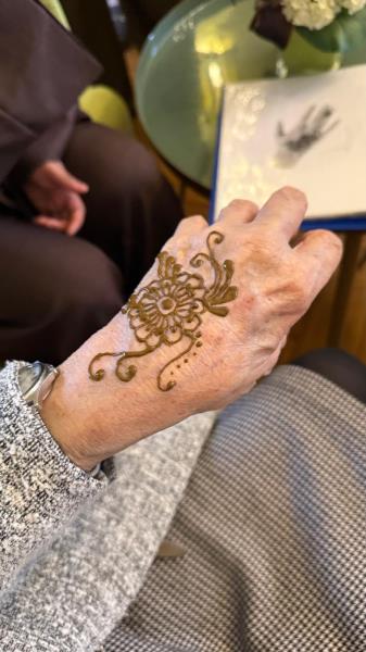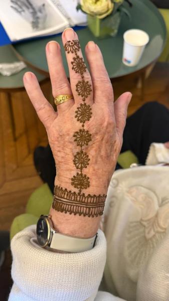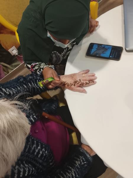 La rencontre s’est poursuivie par un atelier pratique : Saboura a réalisé de magnifiques dessins sur les mains des résidents, ravis de ce moment artistique et convivial. Une parenthèse culturelle et créative qui a enchanté chacun.