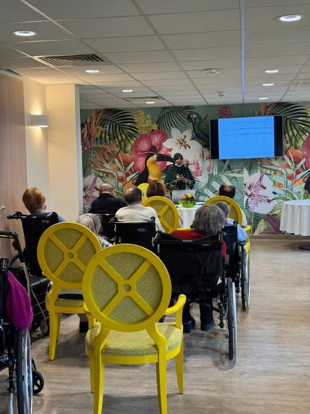 Saboura, bénévole de l’association Sœurlidaires, est venue partager sa passion pour l’art du henné lors d’une conférence riche et captivante. Son intervention, claire, colorée et parfaitement structurée, a fasciné nos résidents dès les premières minutes grâce à une très belle introduction sur l’histoire et les traditions du henné.