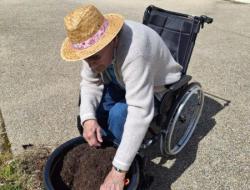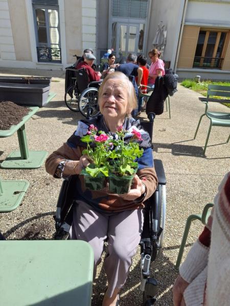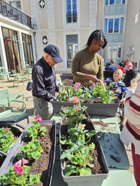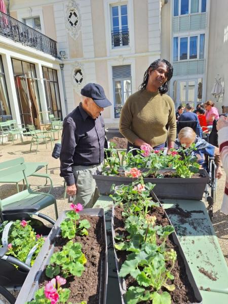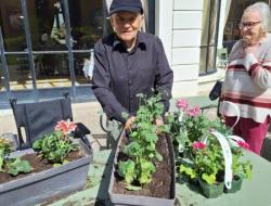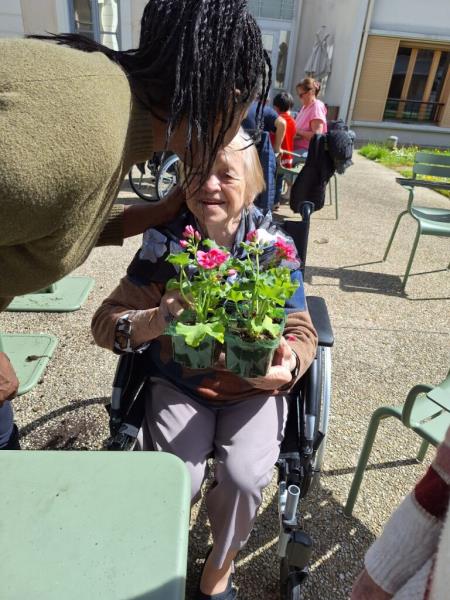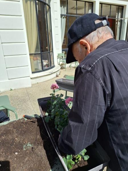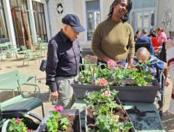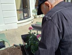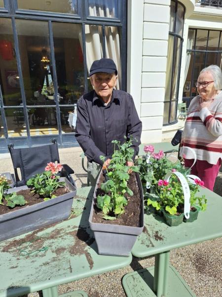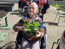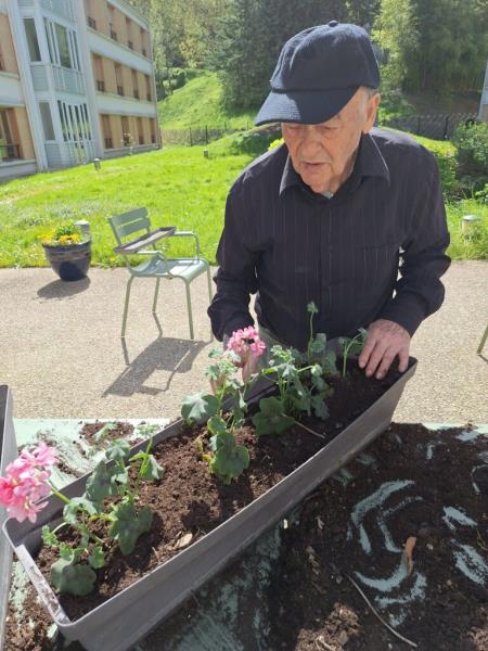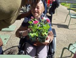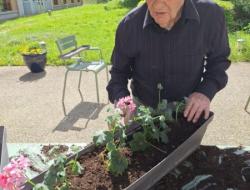 Nos géraniums sont actuellement installés en pots et sont choyés chaque jour grâce à un arrosage régulier, en attendant leur installation définitive prévue mi-mai