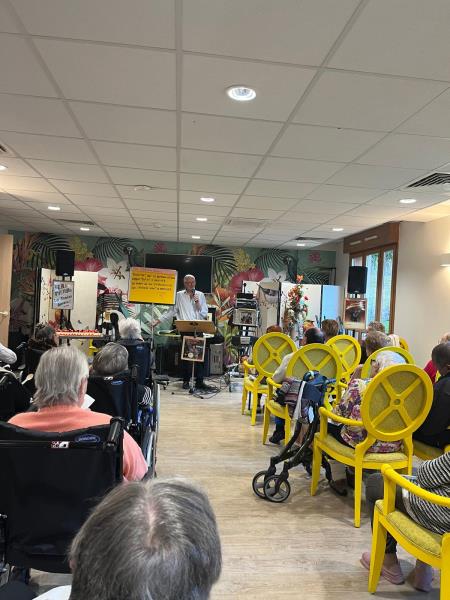 Nous avons célébré les anniversaires d’octobre dans la bonne humeur ! Les résidents ont eu le plaisir d’accueillir Jean-Pierre Besson, qui a répondu à leur demande avec beaucoup de joie. Il nous a transportés dans les années 50 et 60, véritables années-lumière, à travers de magnifiques chansons et des moments d’échanges conviviaux avec chacun. Une fête pleine de nostalgie, de rires et de musique qui restera gravée dans les mémoires.