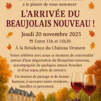 Publiée le 14/11/2025La Résidence du Château Dranem a le plaisir de vous annoncer L’ARRIVÉE DU BEAUJOLAIS NOUVEAU ! Jeudi 20 novembre 2025 Entre 11h et 11h30 À la Résidence du Château Dranem Venez célébrer avec nous ce moment de convivialité autour d’une dégustation d [...] Lire la suite
