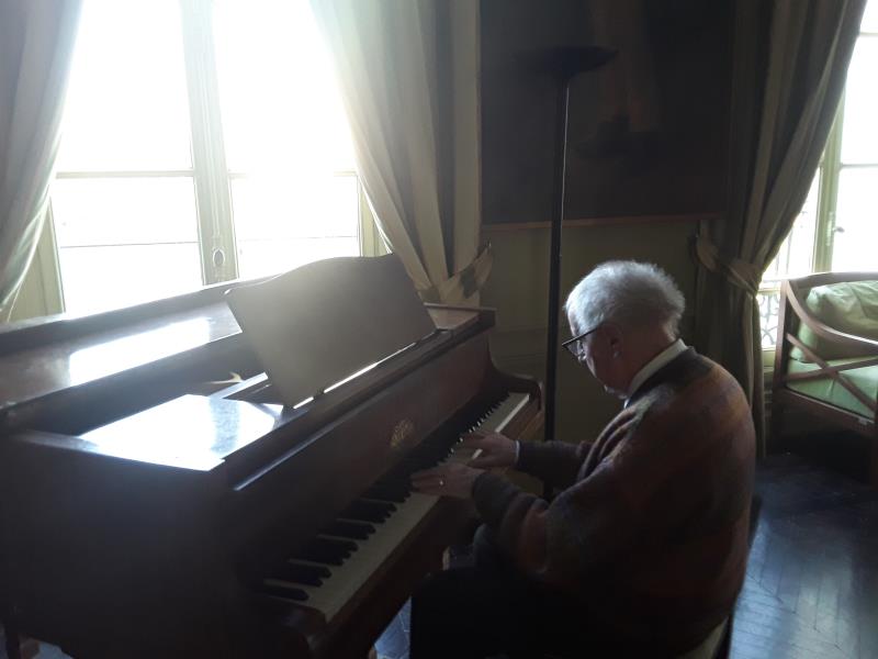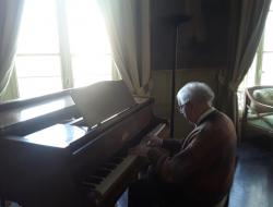 Dans la bibliothèque du château, notre résident Monsieur Janneau prend place devant le piano pour partager sa passion de la musique.et joue ses partitions.